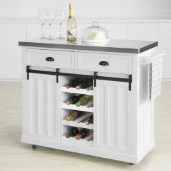 SoBuy FKW94-W Design Küchenwagen Mit Flaschenablage Küchenschrank Mit 2 Schiebetüren Und 2 Schubladen Servierwagen Mit Edelstahlplatte Sideboard Weiß