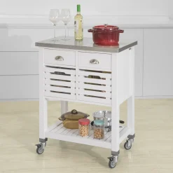SoBuy FKW83-W Servierwagen Mit 2 Körben Und 2 Schubladen Küchenwagen Küchenschrank Rollwagen Mit Edelstahlplatte Weiß