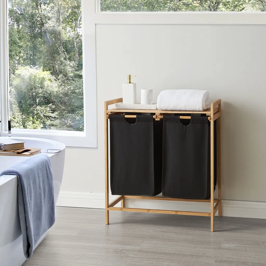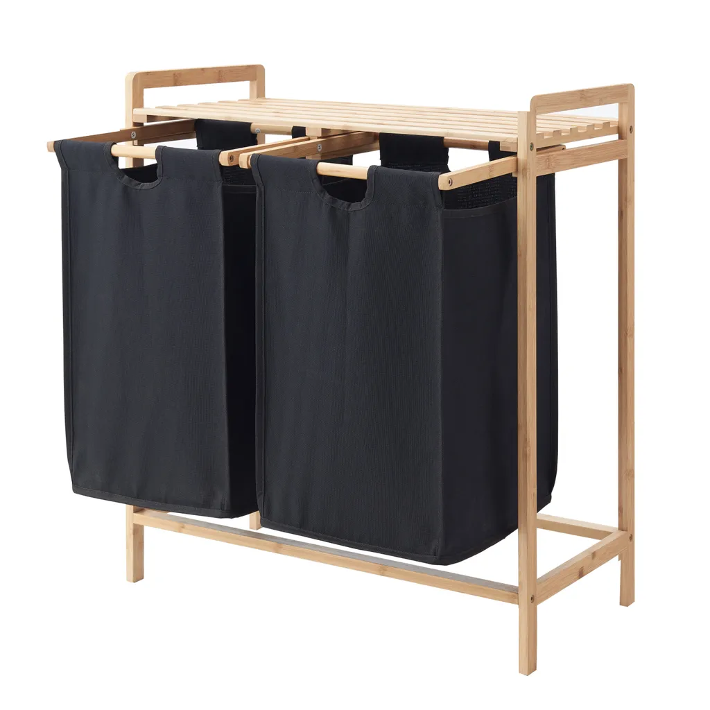 Acaza Wäschekorb Mit 2 Ausziehbaren Wäschesäcken – Wäschesortierer – 44 Liter – Bambus – 64,5×73,5×33 Cm – Schwarz