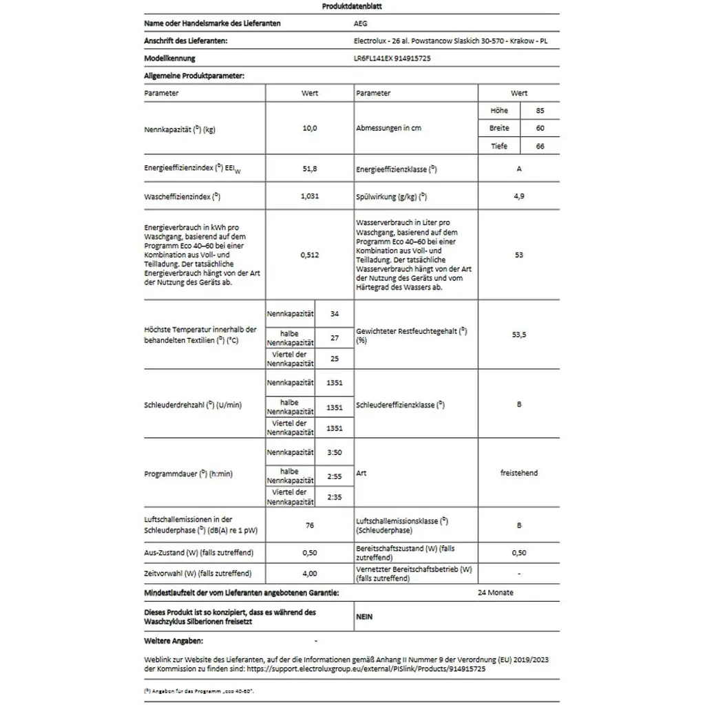 AEG – LR6FL141EX – Waschmaschine – 10 Kg