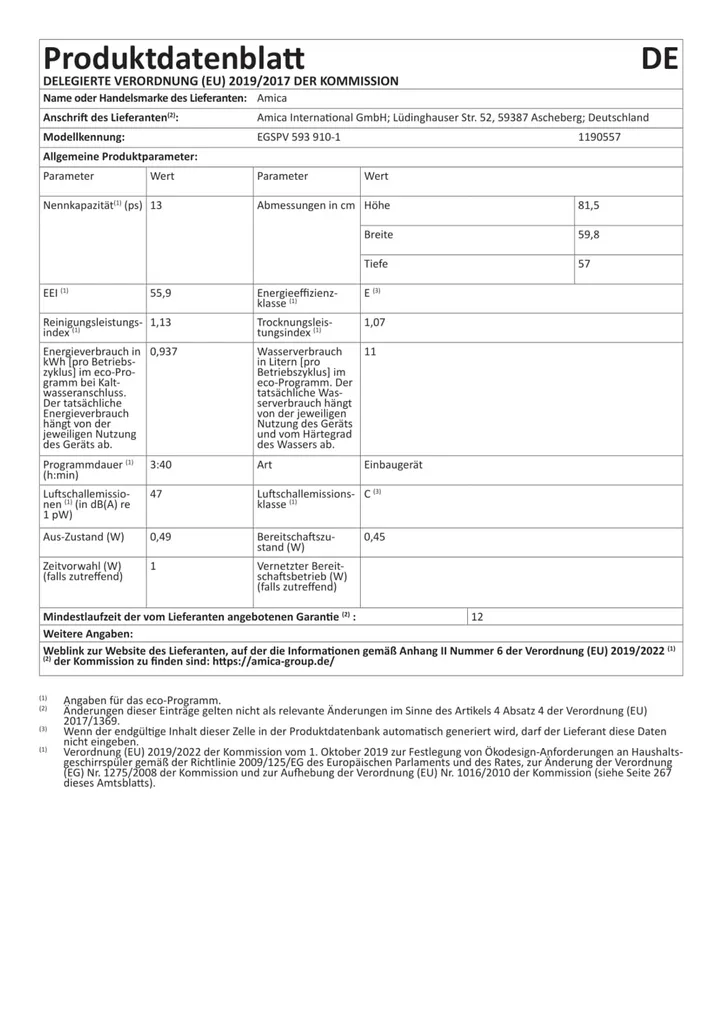 Amica EGSPV 593 910 Vollintegrierter Geschirrspüler – 60 Cm