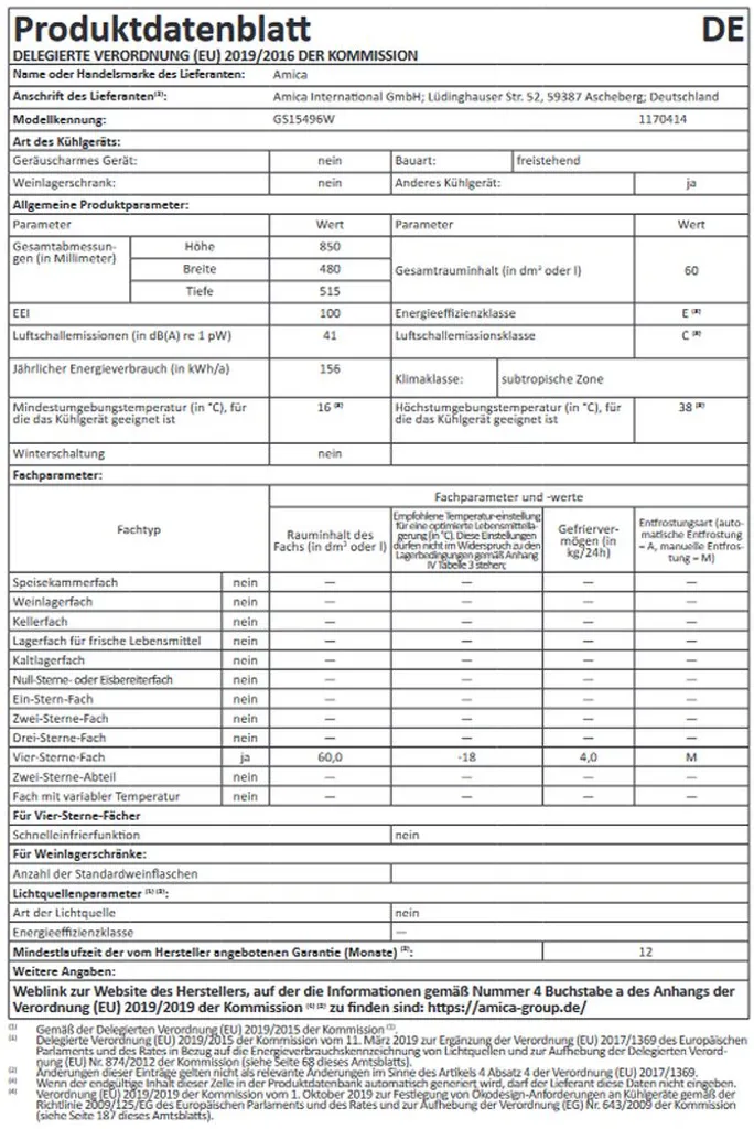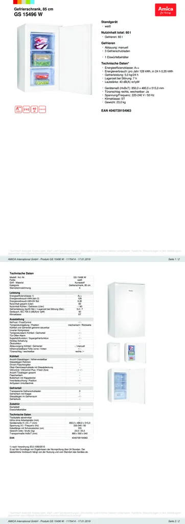 Amica GS 15496 W, Gefrierschrank, 85 Cm Höhe, Weiß,