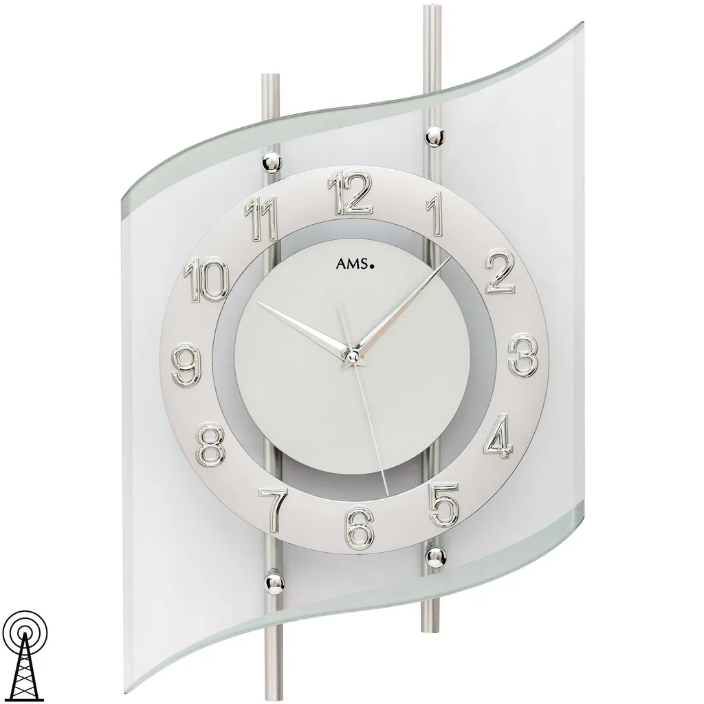 AMS 5506 Wanduhr Funk Funkwanduhr Analog Silbern Modern Geschwungen Mit Glas