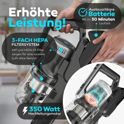 BALTER VERTU X11 PRO Kabelloser Akku Staubsauger Mit Wischfunktion, ALL-IN-ONE Akku- & Handstaubsauger, 350W Hohe Saugleistung, Bis Zu 50 Minuten Laufzeit, Beutellos, FLEX-Gelenk, LED-Düse, Tierhaar Geeignet