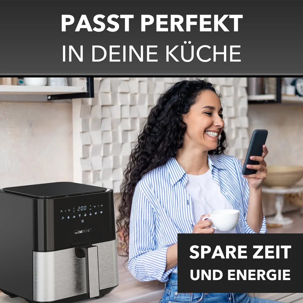 Clatronic® Heißluftfritteuse XXL – 5L Fritteuse Heißluft Für Fettfreies Frittieren, Edelstahl-Airfryer Mit Digitalem Touchscreen, 360° Air-Flow, Heißluft-Friteuse Mit 8 Programmen, 1450W – FR 3782 H