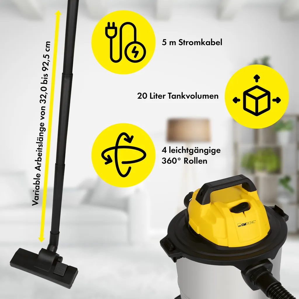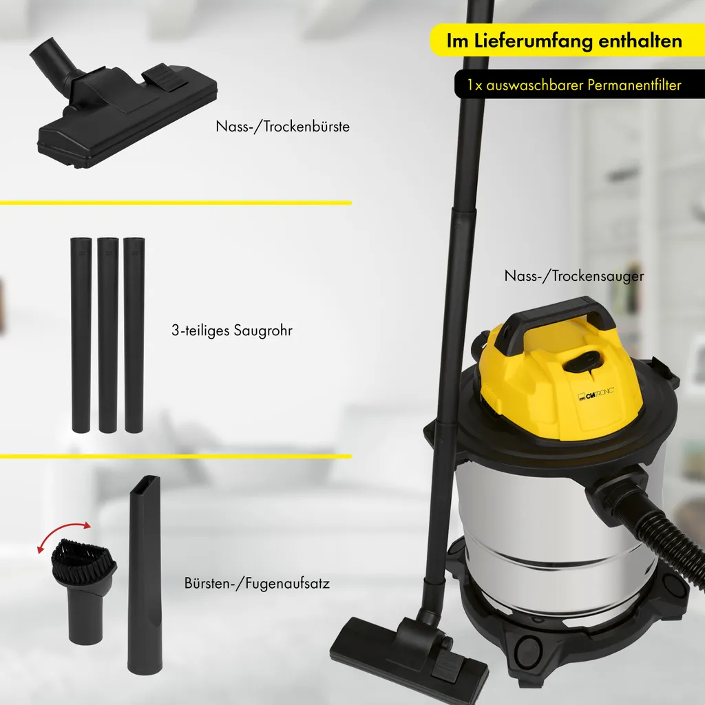 Clatronic Nass Trockensauger 3in1 Trockensauger Nasssauger Und Gebläsefunktion, 20L Tank, Extra Langes Kabel (5m) Inkl. Aufsätze U. Auswaschbarem Permanentfilter, 1200 Watt, BS 1313