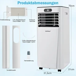 COSTWAY 4in1 Mobile Klimaanlage 9000BTU/2,6 KW Für 30㎡ Klimagerät 54dB Entfeuchter Tragbar 2 Geschwindigkeiten Inkl. 24H Timer, Fernbedienung, Schlafmodus, Abluftschlauch 16℃-32℃ Weiß