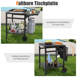 COSTWAY Grilltisch Mit Klappbarer Tischplatte, Beweglicher Campingtisch Mit 2 Ablagen & 4 Haken, Metall Grillwagen Für Außenbereich, Rollwagen Zum Grillen & Outdoorküche, Zubereitungswagen Schwarz