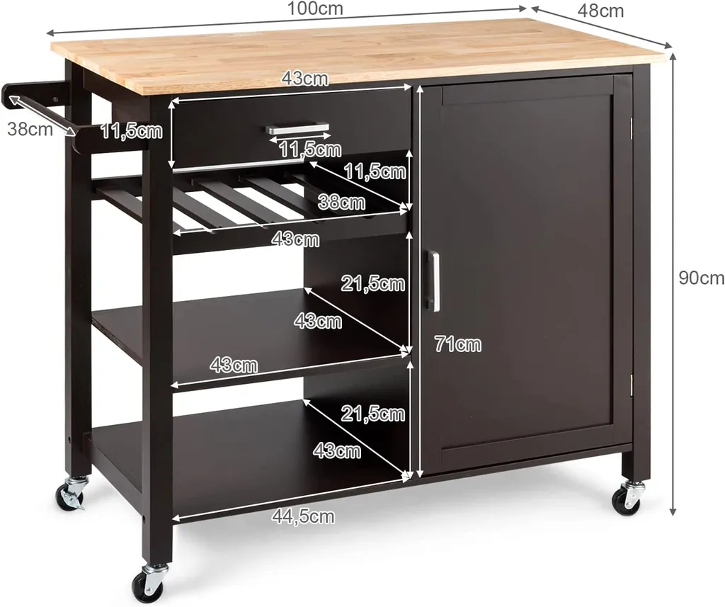 COSTWAY Küchenwagen Auf Rollen, Kücheninsel Mit Schublade, Weinregal, Offene Regale & Handtuchhalter, Platzsparender Servierwagen, Für Küche, Esszimmer, Bar, Braun