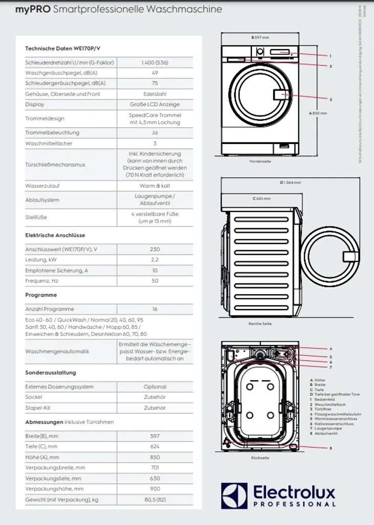 Electrolux Waschmaschine MyPRO Professional 8kg 1400U/min Edelstahl WE170V