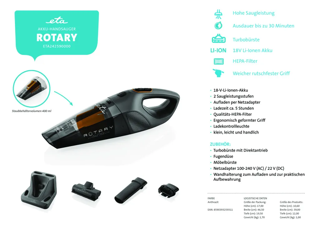 ETA Rotary ETA242590000 Akku-Handsauger, Li-ion Akku 18 V, HEPA-Filter, Elektrischer Rotationsbürste