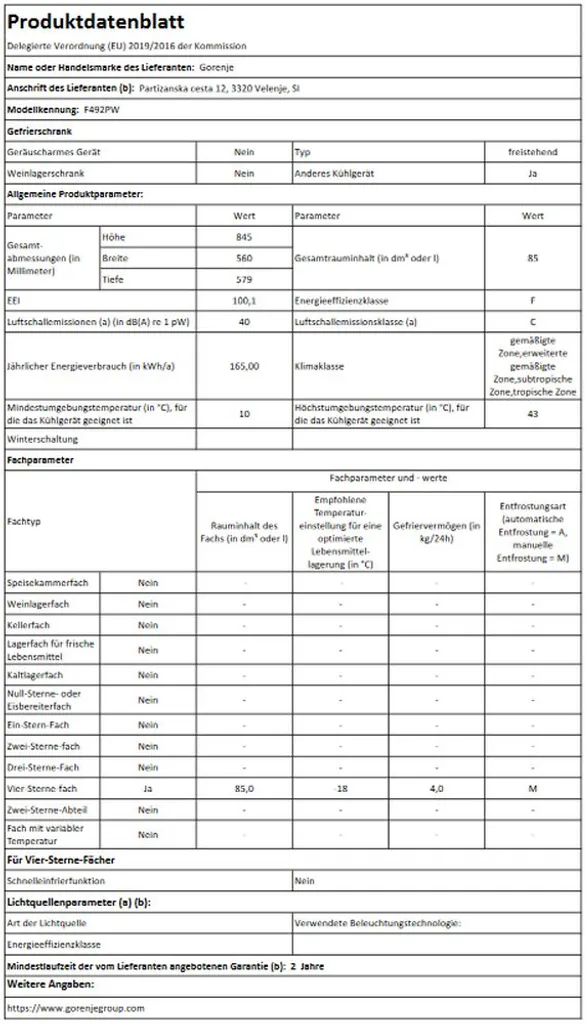 Gorenje F492PW Gefrierschränke – Weiß – Nettokapazität: 82 L – Klimakategorie: N-T, Gefriervermögen: 10 Kg/24h – Lagerzeit Bei Störung: 24 H – Star Bewertung: 4* – Türanschlag: Rechts.