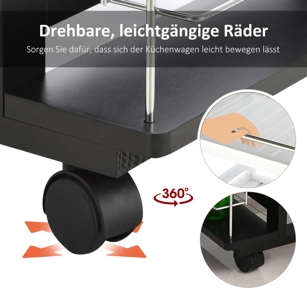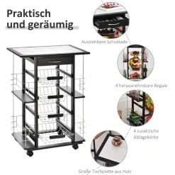 HOMCOM Servierwagen Auf Rollen, Küchenwagen Mit Arbeitsplatte Und Gewürzregal, Rollwagen, Küchentrolley, Kieferholz, Schwarz, 57 X 37 X 83 Cm