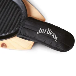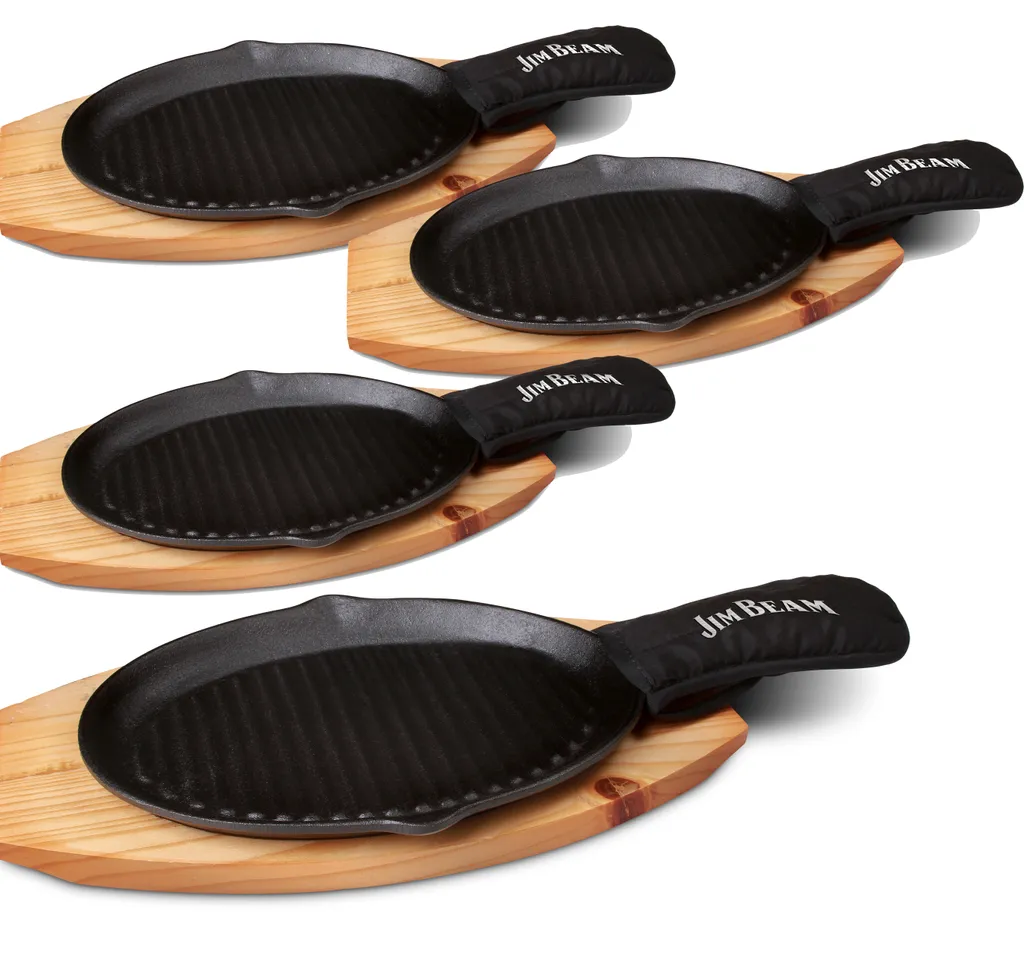 Jim Beam BBQ Servierpfanne Gusseisen – Grillpfanne Steakpfanne Emaille Mit Holzuntersetzer Servierbrett 4er Set
