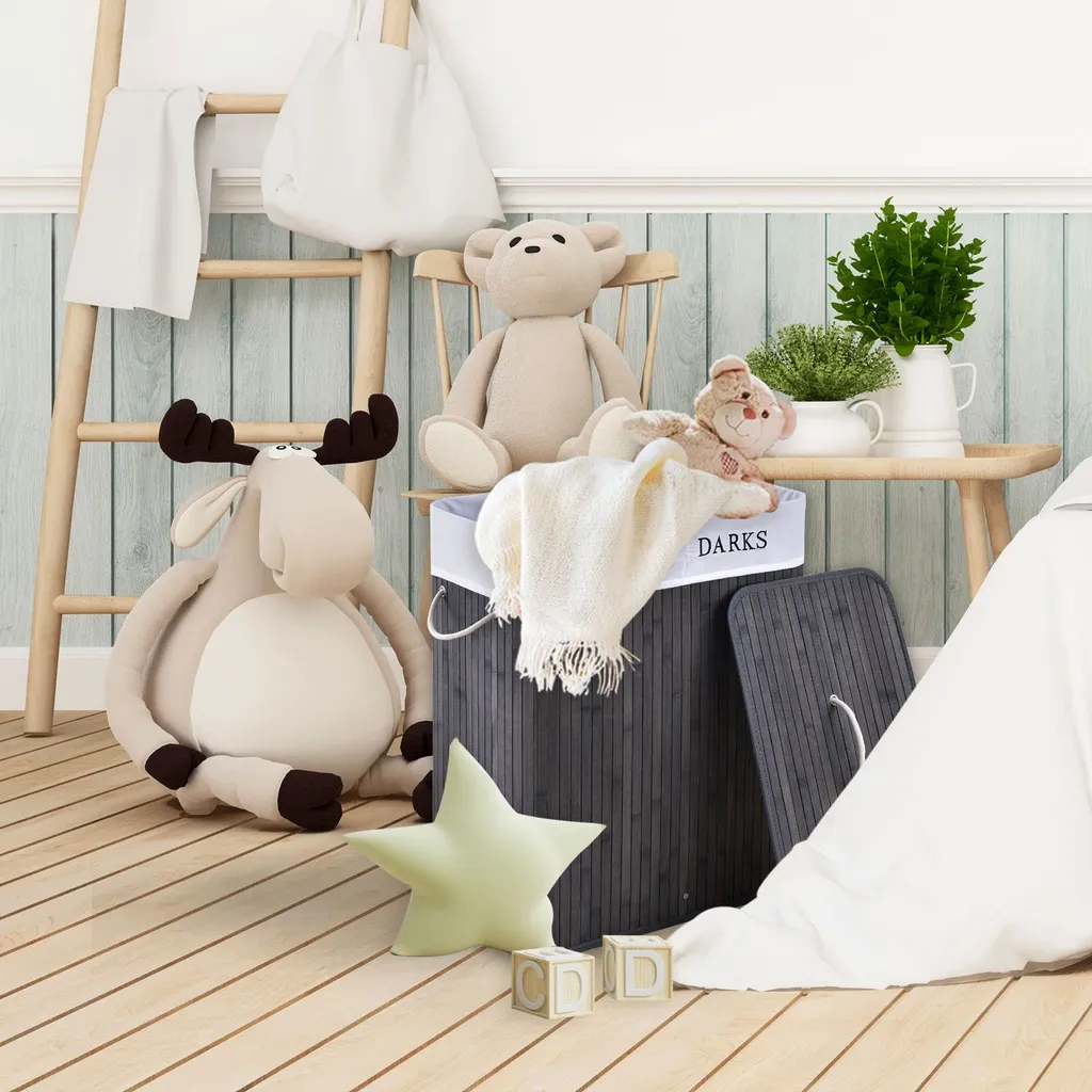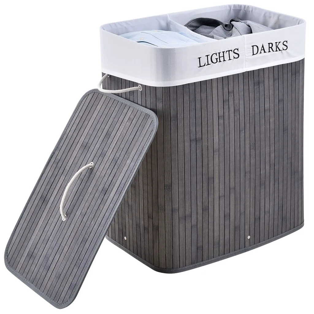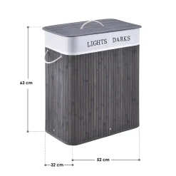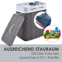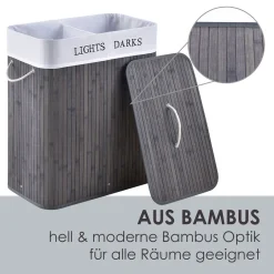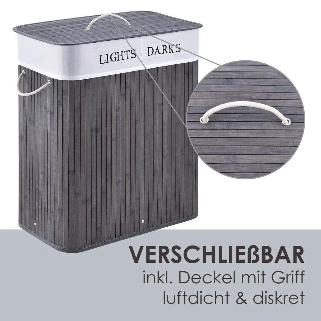 Juskys Bambus Wäschekorb Curly – 100 Liter Wäschesammler Mit Deckel, Griff & Stoff Wäschesack – 2 Fächer Wäschesortierer – Wäschebox In Grau