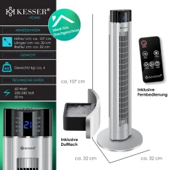 KESSER® Turmventilator Mit Fernbedienung | 3 Stufen | 3 Modi | 107cm | 60 Watt | 7,5 Timer | LED-Leuchten | Tower-Ventilator | Standventilator | Säulenventilator | Luftkühler 90° Oszillierend, Farbe:Silber