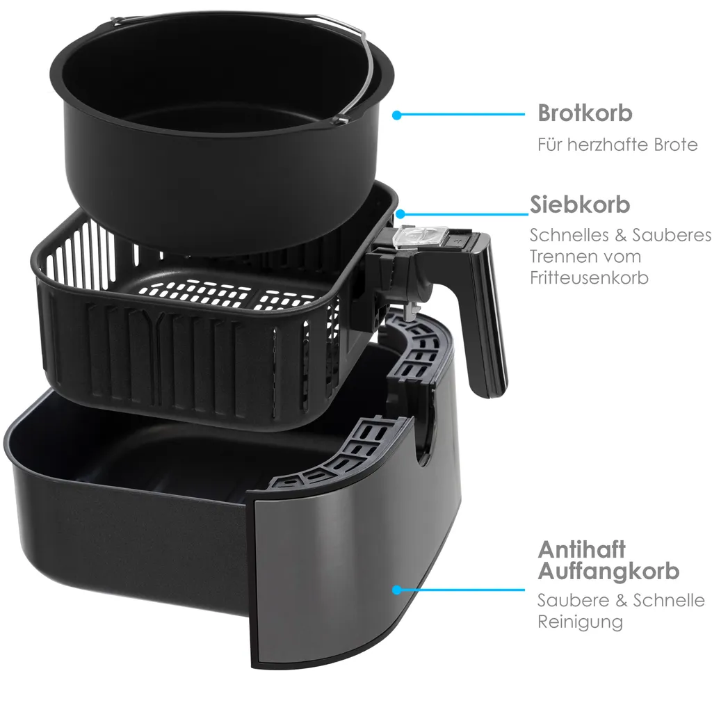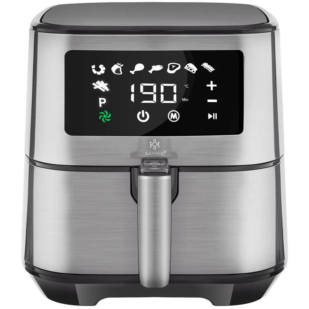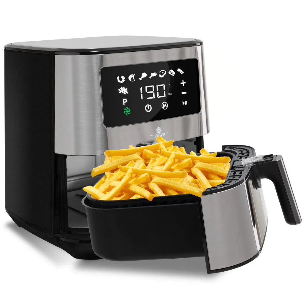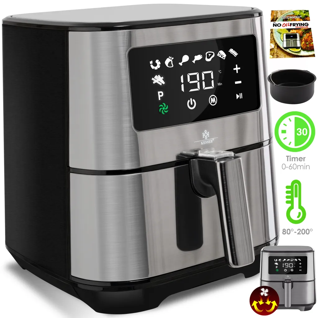 Kesser® XXL 5,5 Liter Heißluftfritteuse Edelstahl | Inkl.Brotbackkorb | 1700W Friteuse Fritteuse Airfryer | Touch Display | 8 Programmen | Ohne ÖL | ✓ Backofen ✓ Heißluft ✓ Grill | Fettfrei, Farbe:Silber