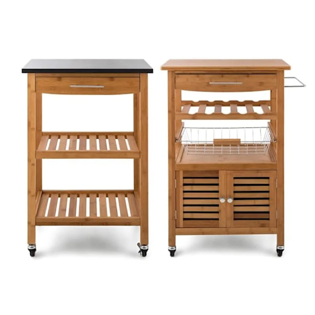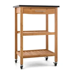Klarstein Tennessee Servierwagen – Küchenwagen , Rollwagen , 3 Etagen , 2 Ablageflächen , Herausnehmbare Schublade , Schwarze Granitarbeitsfläche , Sichere Feststellbremsen , Bambusholz , Braun