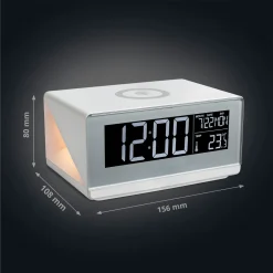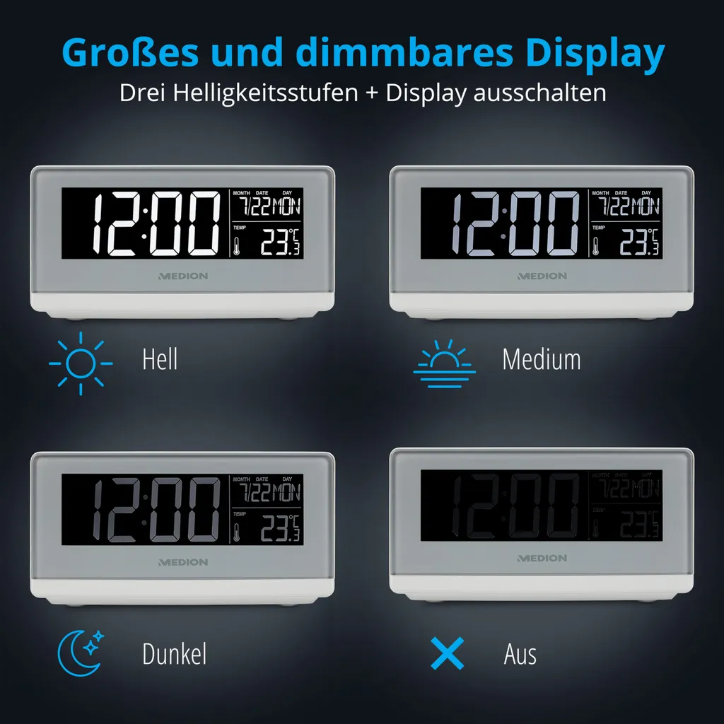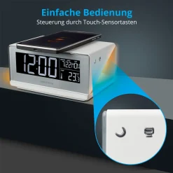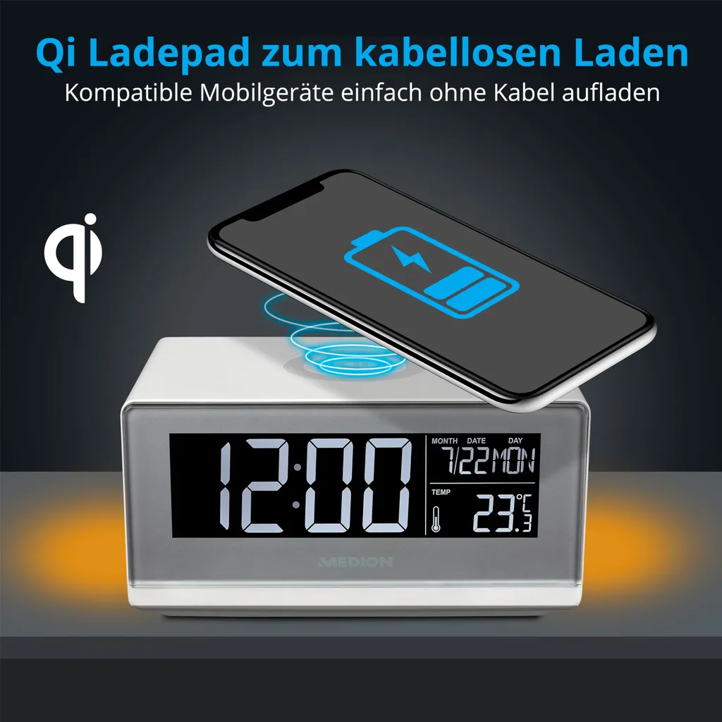 MEDION E75009 Wecker Mit Qi Ladefunktion (Weckstation, Ladestation, Induktives Laden, Temperaturanzeige, Snooze Schlummerfunktion, Timer, Displaydimmer) Silber