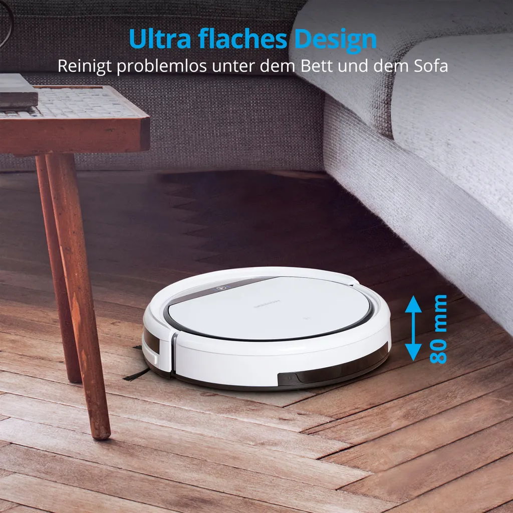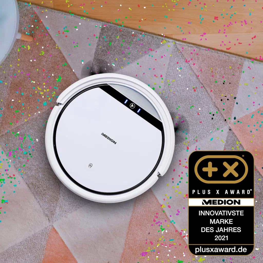 MEDION Saugroboter Mit Ladestation E32 (Modell 2021, Roboterstaubsauger Für Hartböden, Fliesen, Laminat, Tierhaar Optimiert, Direktabsaugung, Autom. Rückkehr Zur Ladestation)