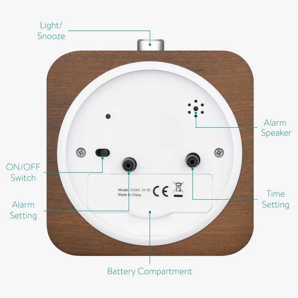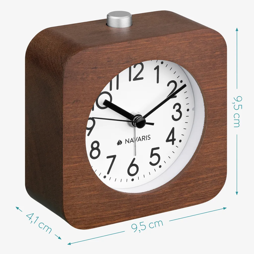Navaris Analog Holz Wecker Mit Snooze – Retro Uhr Viereck Design Mit Weißem Ziffernblatt Alarm – Leise Tischuhr Ohne Ticken – Holzwecker Dunkelbraun