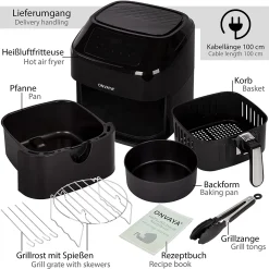 ONVAYA® Heißluftfritteuse | Airfryer XXL | Fritteuse Ohne Öl & Fett | Für 5-6 Personen | Mit LED-Display | 10 Programme | 1700 W | Inkl. Backform & Grillrost Mit Spießen
