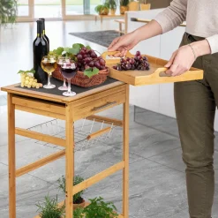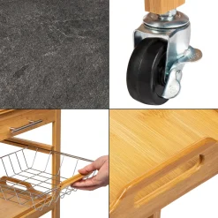 ONVAYA Küchenwagen Kyoto Auf Rollen, Küchenrollwagen Aus Bambus Mit Arbeitsplatte Schwarz Aus Stein, Praktischer Beistellwagen Für Die Küche Inkl. Schubladen