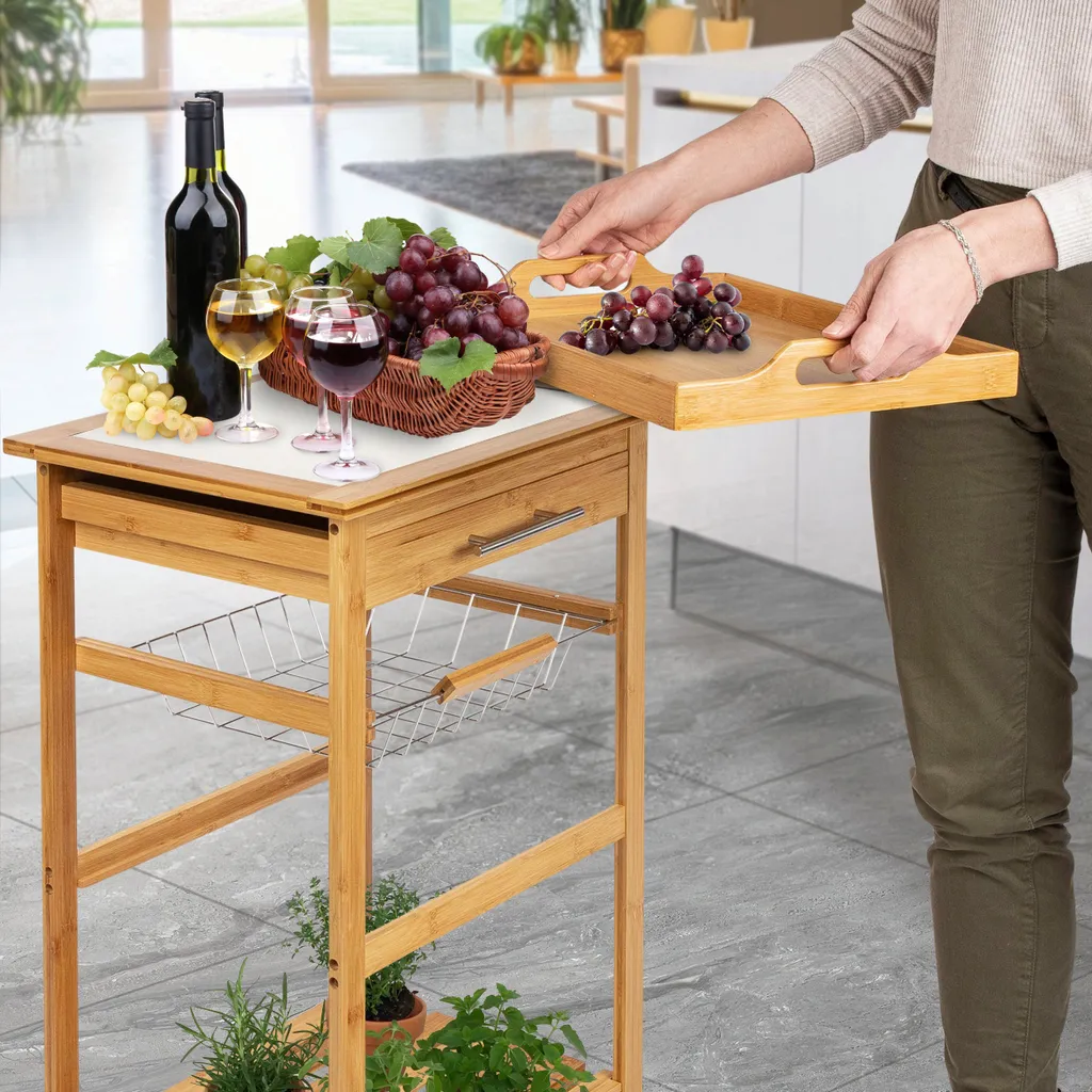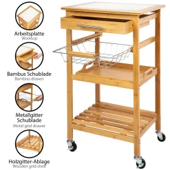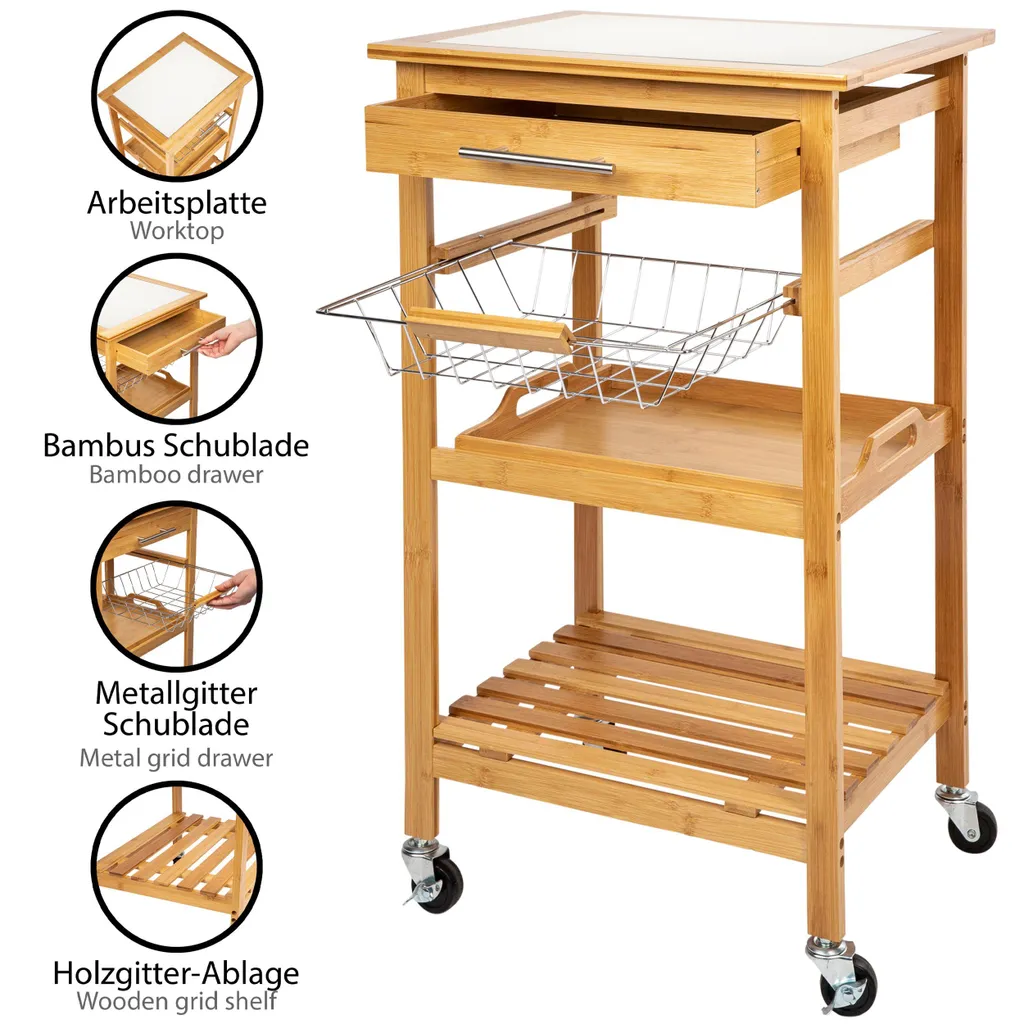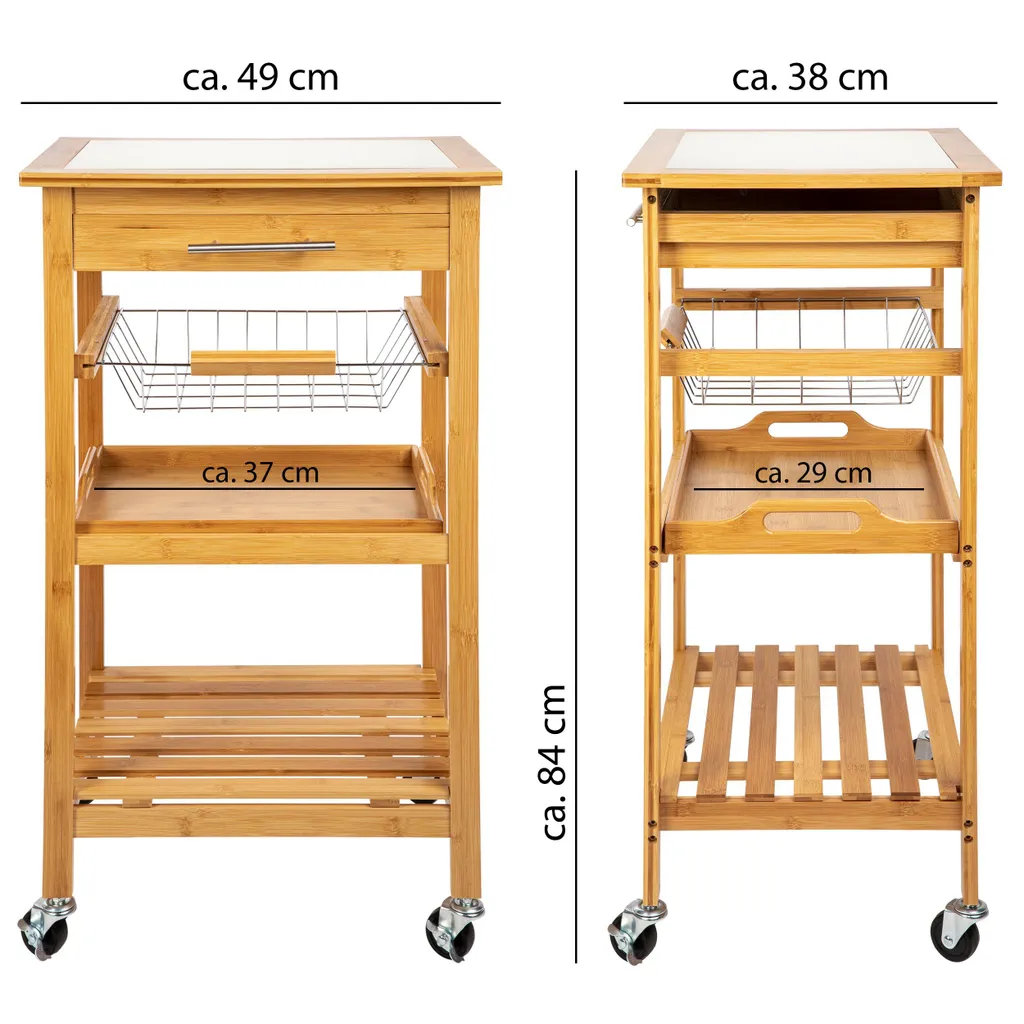 ONVAYA Küchenwagen Kyoto Auf Rollen, Küchenrollwagen Aus Bambus Mit Arbeitsplatte Weiß Aus Stein, Praktischer Beistellwagen Für Die Küche Inkl. Schubladen