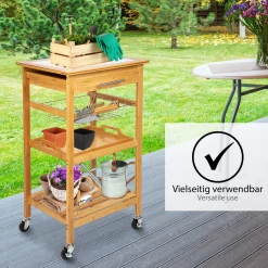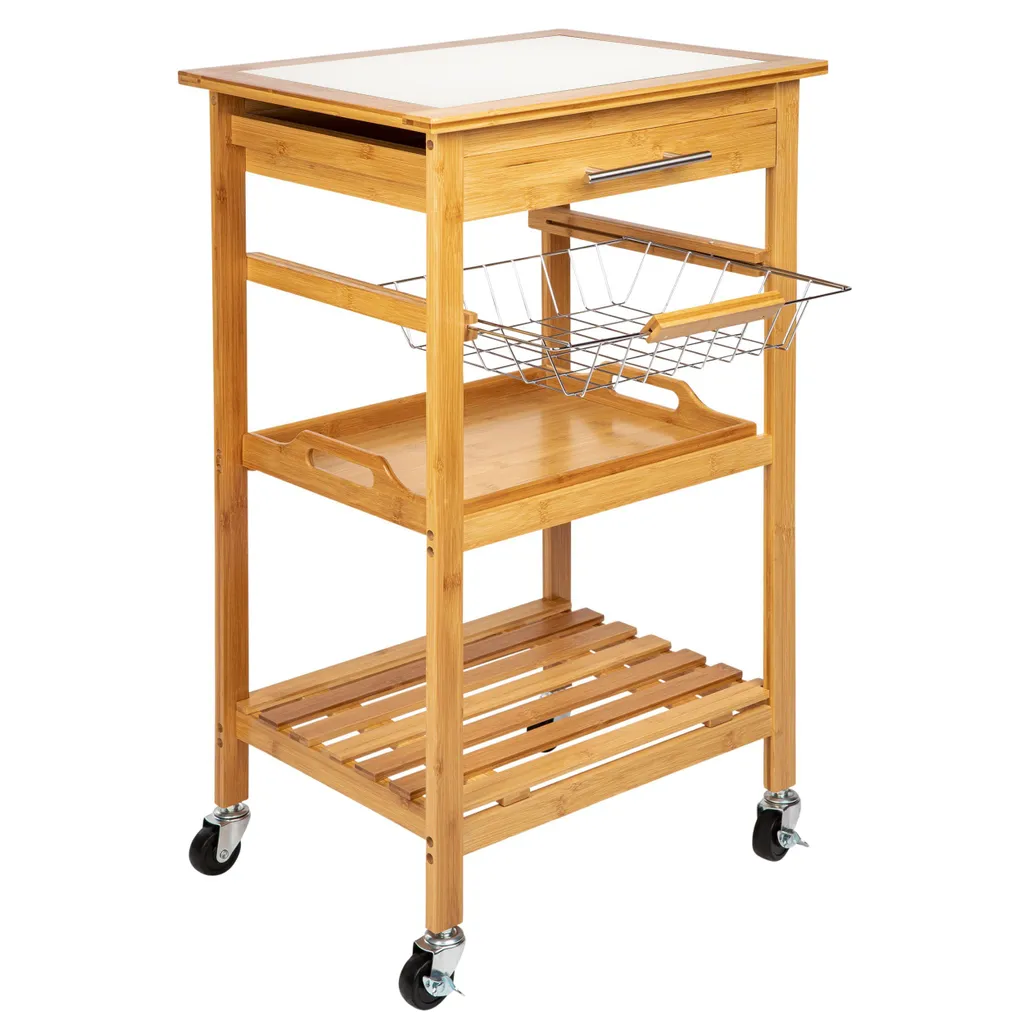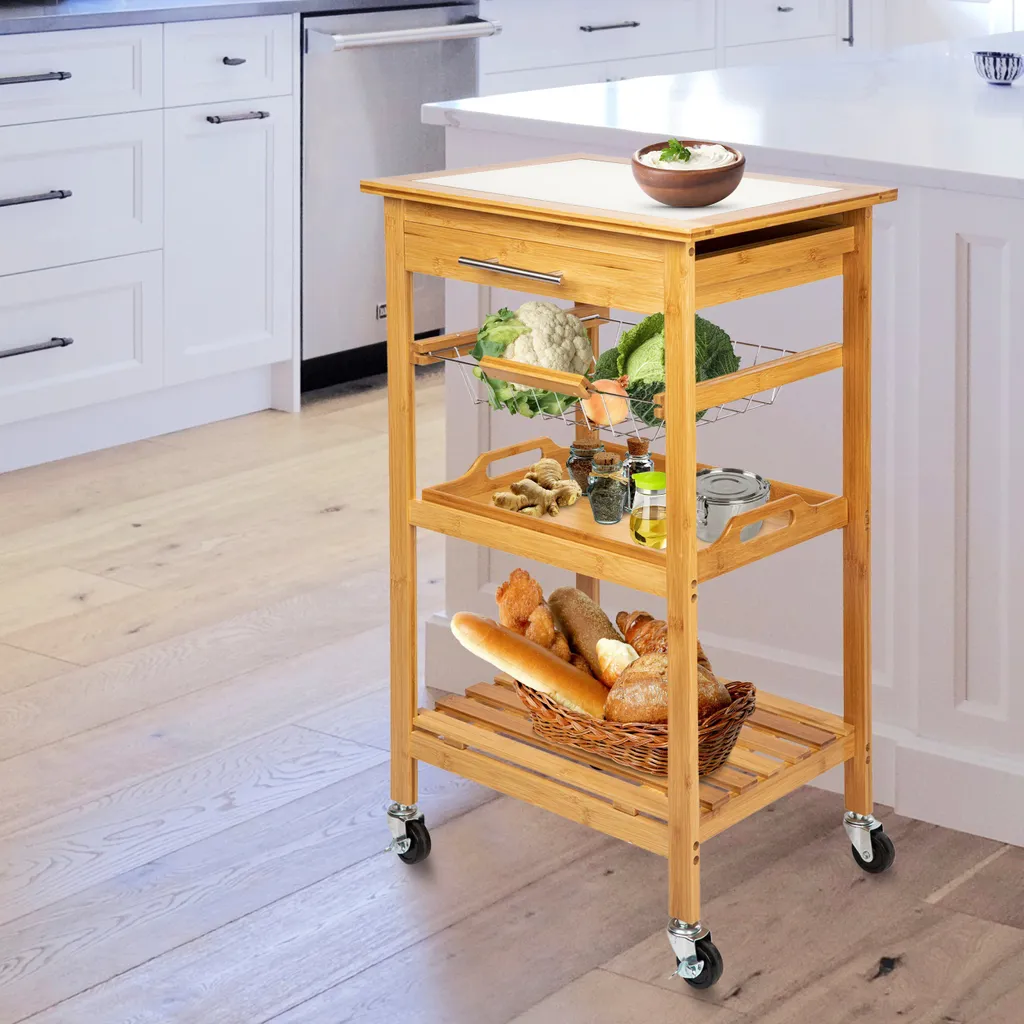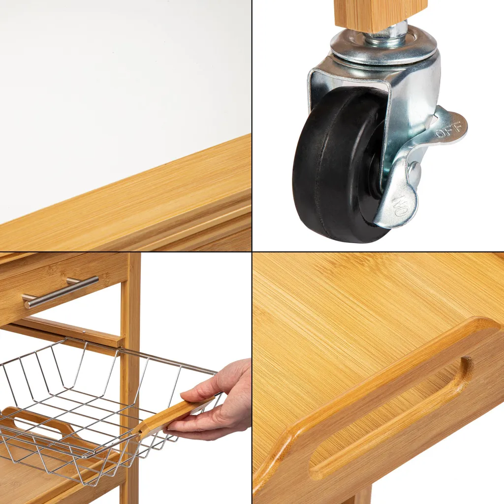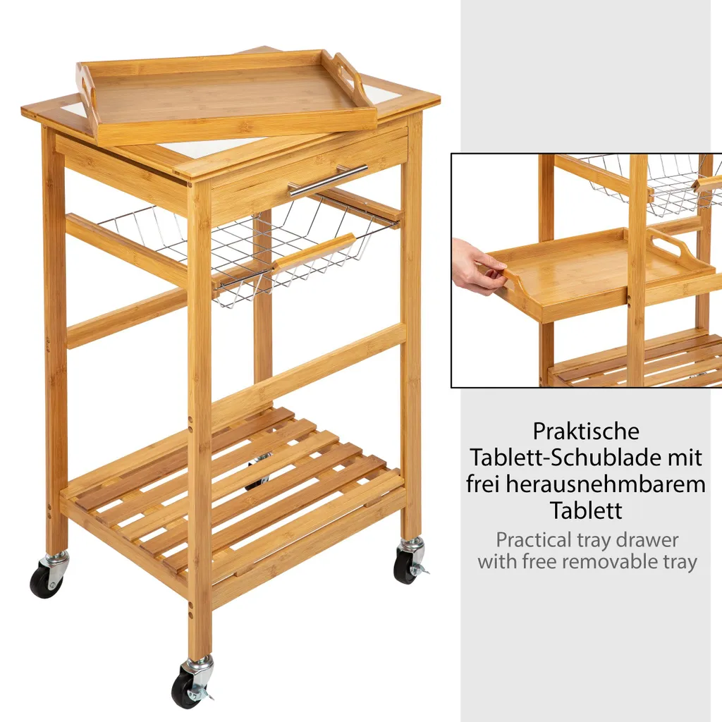 ONVAYA Küchenwagen Kyoto Auf Rollen, Küchenrollwagen Aus Bambus Mit Arbeitsplatte Weiß Aus Stein, Praktischer Beistellwagen Für Die Küche Inkl. Schubladen