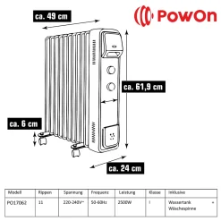 PowOn Ölradiator 2500W Energiesparend 11 Rippen Mit Wäschetrockner & Luftbefeuchter