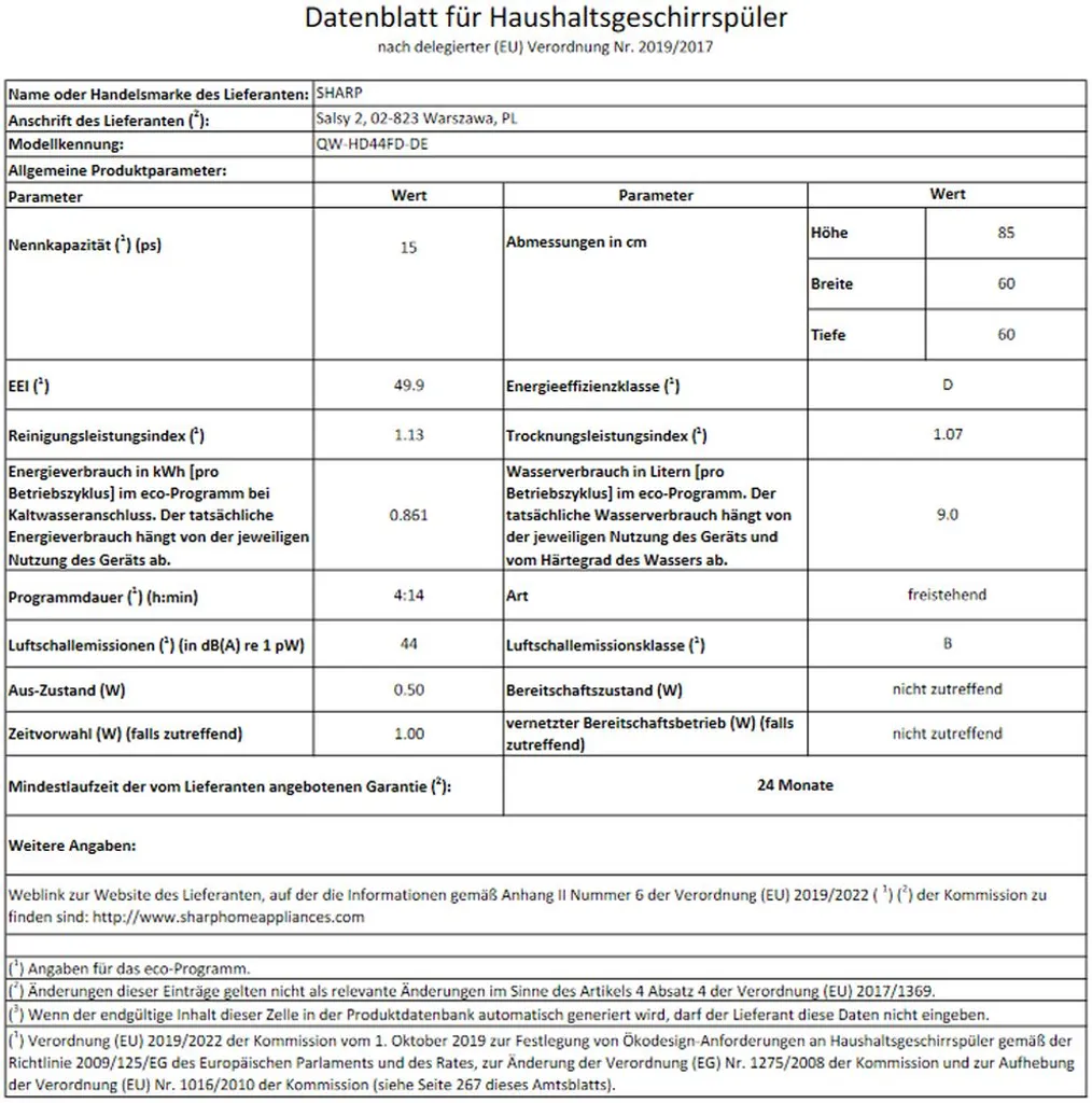 Sharp QW-HD44FD-DE 60 Cm Freistehende Geschirrspüler 15 Maßgedecke Aquastop