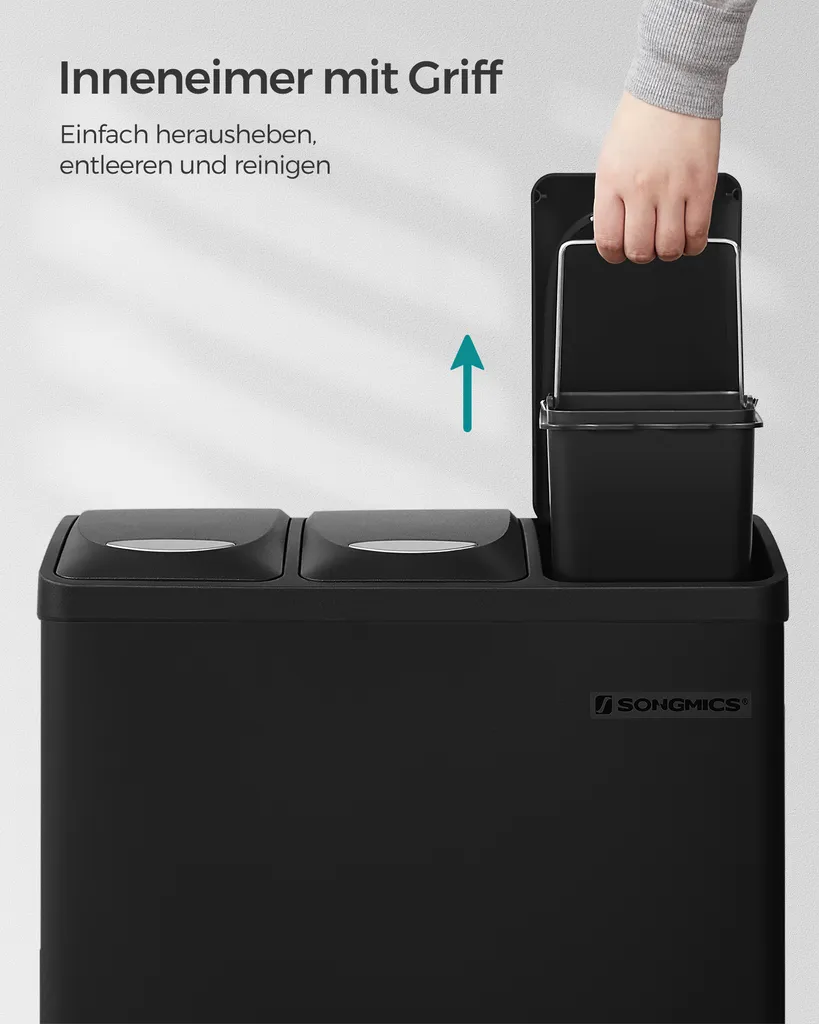 SONGMICS Mülleimer Für Die Küche, 3 X 8 Liter, Abfalleimer Aus Metall, 3-in-1 Treteimer, Mülltrennung, Mülltrennsystem, 15 Müllbeutel, Einfach Zu Reinigen, Stahl, Schwarz LTB24BK