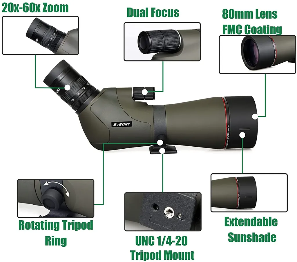 Svbony SV46 Teleskop Spektiv, 20-60×80 Spektive Vogelbeobachtung, Wasserdichte Bak4 Prisma FMC Optik Dual Focus Speed Für Jagd Wildtiere Landschaft, Zuhause Oder Outdoor