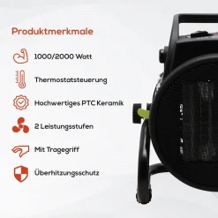 Tronitechnik TT-KH-502 Keramikheizer Heizlüfter Heizung 2.000 Watt, Tragegriff, PTC Keramik, Stufenlose Thermosteuerung