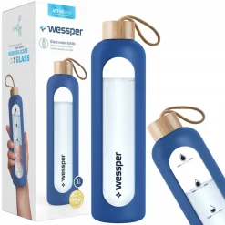 Wessper Set: AquaMax Crystalline 2.5L Glaskrug Mit Filter + ActiveMax Crystalline 1L Glas-Incentiveflasche Mit Silikonhülle Blau